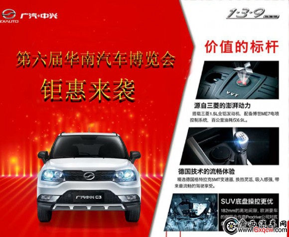 現(xiàn)場鑒賞最新款車型:廣汽大自主首款小型SUV——廣汽中興GX3;中興威虎TUV 2015款。其他各款車型也有各種力度不一的優(yōu)惠,現(xiàn)場可提供各種金融購車服務(wù),歡迎大家到車展現(xiàn)場33號廣汽中興展位或南寧駿鴻達(dá)安吉展廳咨詢!