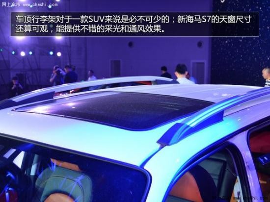 新海馬S7的車身尺寸相較老款車型沒有變化;略微上揚(yáng)的腰線的較短的前后懸讓整車看起來很緊繃,有一種蓄勢待發(fā)的感覺;原廠的側(cè)踏板提高了上下車便利性。車頂行李架對于一款SUV來說是必不可少的;新海馬S7的天窗尺寸還算可觀,能提供不錯的采光和通風(fēng)效果。