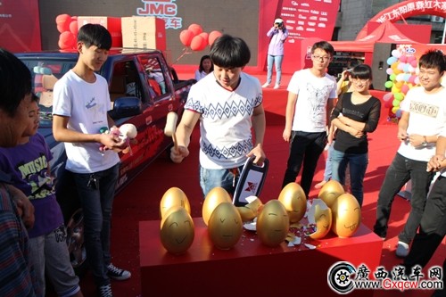 裝箱大賽后的購(gòu)車客戶集體砸金蛋活動(dòng),更是調(diào)動(dòng)了在場(chǎng)觀眾的情緒,很多人好奇地圍在放有多顆金蛋的桌子周圍一看究竟。華成4S店邀請(qǐng)了多位在現(xiàn)場(chǎng)訂車的新客戶砸金蛋,金蛋里是表明現(xiàn)金數(shù)額的禮券,最高的是5000元。江鈴汽車的新車主先后走到金蛋前,信心滿滿地舉起木錘砸向選好的金蛋,隨著“啪啪啪”的砸蛋聲,禮券一張張飄出。這時(shí)觀眾似乎比選手還要著急、還要好奇,紛紛上前詢問(wèn):砸到了多少?有趣的是,幾位新車主不謀而合地砸到了800元的獎(jiǎng)勵(lì)。“雖然不是大獎(jiǎng),但已經(jīng)很不錯(cuò)了,非常開(kāi)心,感謝江鈴汽車、感謝名城巡展!蹦弥(jiǎng)券的一位新車主說(shuō)。