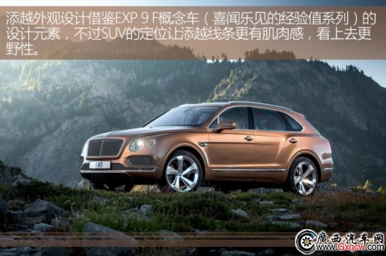添越繼承EXP 9 F概念車的設(shè)計(jì)元素,卻放棄了它過(guò)于激進(jìn)的設(shè)計(jì)風(fēng)格,而是選擇與賓利經(jīng)典的家族設(shè)計(jì)融合,能看出飛馳的影子。大尺寸倒梯形中網(wǎng)折角分明,懸浮雙翼造型下格柵霸氣又精致,標(biāo)志性的四眼圓燈辨識(shí)度高。