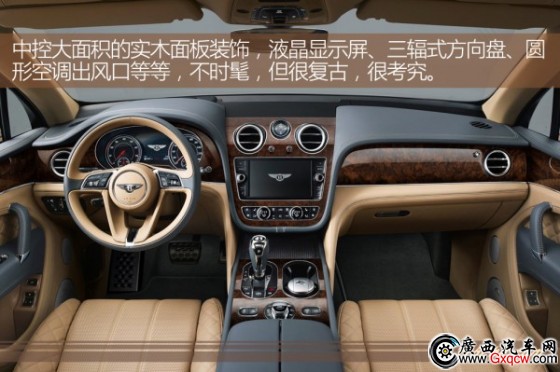 內(nèi)飾是經(jīng)典的賓利家族式設(shè)計(jì),中控配一個(gè)大尺寸液晶顯示屏,上方有圓形的空調(diào)出風(fēng)口和彰顯檔次感的石英鐘。作為一款超豪華SUV,添越在用料和做工上均達(dá)到極致,中控使用大面積實(shí)木面板裝飾,并配高檔真皮包裹。三輻式方向盤內(nèi)外圈使用不同顏色皮革縫合而成,造型設(shè)計(jì)也莊重大氣。