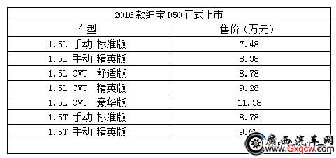 人民網(wǎng)北京11月16日電(涂欽瀚)近日,2016款北汽紳寶D50車型正式上市,新車售價(jià)區(qū)間為7.48萬-11.38萬元,與現(xiàn)款車型售價(jià)區(qū)間保持一致。新車共推出7款車型,搭載1.5L自然吸氣和1.5T渦輪增壓發(fā)動(dòng)機(jī)。