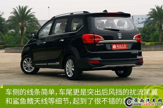 車側(cè)的線條簡單,但是能看到很清晰的腰線和車門下沿的線條,結(jié)合車頂金屬風(fēng)格的行李架,讓寶駿730的車身并不單一。車尾也有一些設(shè)計,比如突出后風(fēng)擋的擾流尾翼和鯊魚鰭天線等,都起到了很不錯的裝飾效果。