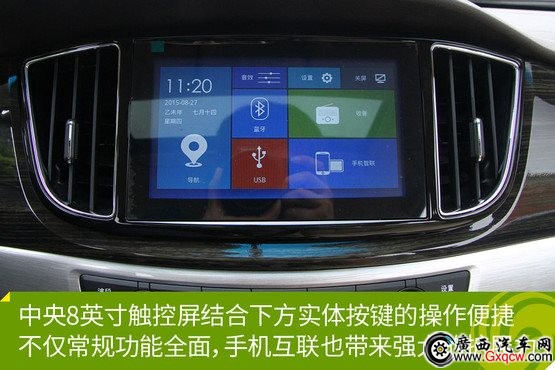 一進(jìn)入車內(nèi),目光很容易就被中控臺上方這塊8英寸的觸控液晶屏所吸引,從顯示界面看與Win8系統(tǒng)的設(shè)計很相似。觸控結(jié)合下方實體按鍵的操作很便 捷,按鍵和觸控屏菜單均按照國人習(xí)慣采用中文標(biāo)識,很容易掌握。所配備的手機(jī)互聯(lián)功能更為新潮,能夠?qū)⑹謾C(jī)顯示的內(nèi)容映射到車載液晶屏上,由此車輛多媒體 系統(tǒng)就獲得了手機(jī)相應(yīng)的功能,比如多媒體播放、衛(wèi)星導(dǎo)航等,擴(kuò)展性不容小視。