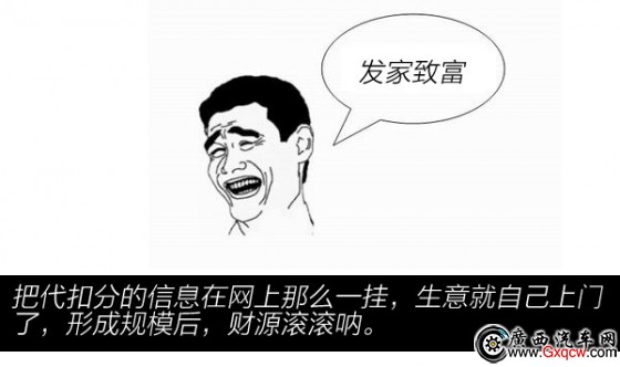 朋友C說,這可是條發(fā)家致富的好路子。把代扣分的信息在網(wǎng)上那么一掛,生意就自己上門了,形成規(guī)模后,財源滾滾吶。