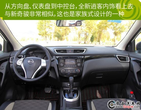 從方向盤、儀表盤到中控臺(tái),全新逍客內(nèi)飾看上去和用起來都與新奇駿非常相似,這也是家族式設(shè)計(jì)的一種。內(nèi)飾的質(zhì)感相比上一代車型有很大進(jìn)步,用到了很多軟性材質(zhì),這是中國消費(fèi)者很喜歡的。當(dāng)然,深色內(nèi)飾有一個(gè)問題就是,光亮的中控臺(tái)面板有點(diǎn)兒灰塵就很容易顯臟。