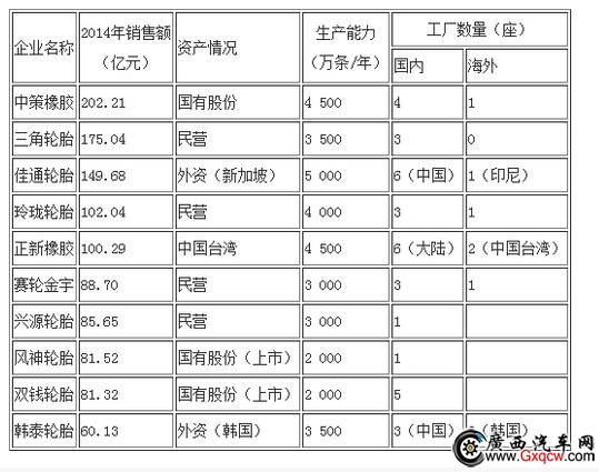以2014年輪胎銷售額排名,全國已形成年營業(yè)額在60億元以上的10大輪胎企業(yè)集團。10大輪胎企業(yè)中,民營為4家、外資為3家、國有為3家。
