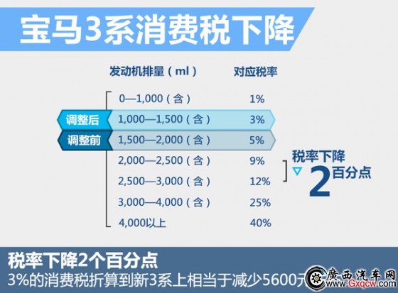 現(xiàn)款3系的入門車型搭載的是一款1.6T壓發(fā)動機,在車價當中稅率部分包括了5%的消費稅和17%的增值稅。其中增值稅相對固定,因此消費稅在車輛價值中的影響因素更為重要!跋M稅”由生產(chǎn)企業(yè)向稅務(wù)機關(guān)繳納,但最終會體現(xiàn)在車價當中。以目前316Li車型28.3萬元的車價計算,2%的消費稅折算到新車上相當于減少5600元左右。