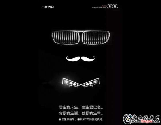 就在奔馳、寶馬的這兩條廣告刷爆朋友圈的時候,一張有著一汽-大眾奧迪水印的廣告圖也加入了戰(zhàn)局,它在寶馬版圖片的胡須下方加入了一對犀利大燈組成的“領(lǐng)結(jié)”,最下方的文案也顯示出:奧迪是一家歷史介于奔馳和寶馬之間的老牌車企。