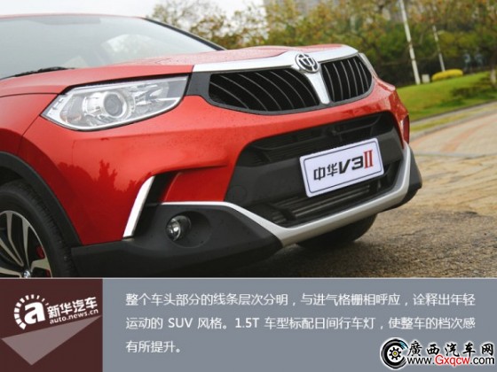 中華V3二代前部造型采用了家族式臉譜設計,亞光黑與亞光銀搭配的直瀑式進氣格柵一定程度增強了立體感。整個車頭部分的線條層次分明,與進氣格柵相呼應,詮釋出年輕運動的SUV風格。1.5T車型標配日間行車燈,使整車的檔次感有所提升。