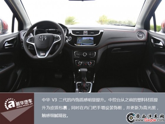 中華V3二代的內飾質感明顯提升。中控臺從之前的塑料材質提升為皮質包裹,同時在內門把手增設裝飾框,并更新為高光黑,觸感細膩精致。在許多細節(jié)之處,中華V3二代也十分用心,方向盤采用紅色縫線設計,全系皮質座椅和全系中央扶手更在同級車中獨樹一幟。