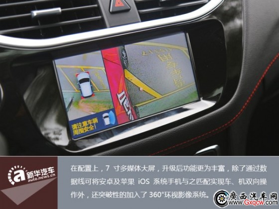 在配置上,7寸多媒體大屏,升級后功能更為豐富,除了通過數(shù)據(jù)線可將安卓及蘋果iOS系統(tǒng)手機與之匹配實現(xiàn)車、機雙向操作外,還突破性的加入了360°環(huán)視影像系統(tǒng),在原有車型基礎上增添四顆攝像頭,分別位于車頭、左右后視鏡及車尾,超寬視角,無縫拼接的適時圖像信息徹底消除車輛周圍的視覺盲點。
