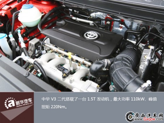 中華V3二代搭載了一臺1.5T發(fā)動機,最大功率110kW、峰值扭矩220Nm。這臺發(fā)動機是華晨自主研發(fā)的發(fā)動機,采用了輕量化設計,同時具有四氣門雙頂置凸輪軸、連續(xù)可變氣門正時系統(tǒng)等技術。