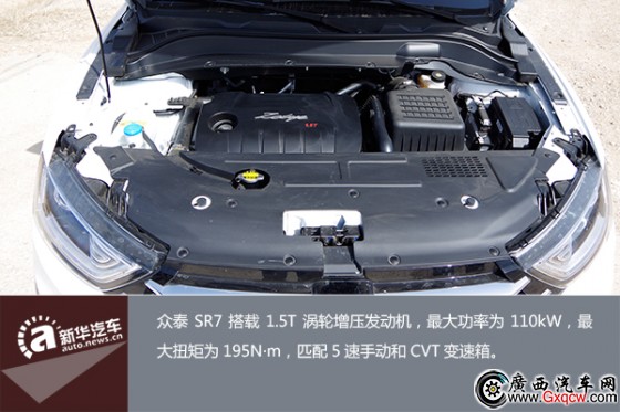 眾泰SR7搭載1.5T渦輪增壓發(fā)動機(jī),最大功率為110kW,最大扭矩為195N·m,匹配5速手動和CVT變速箱。
