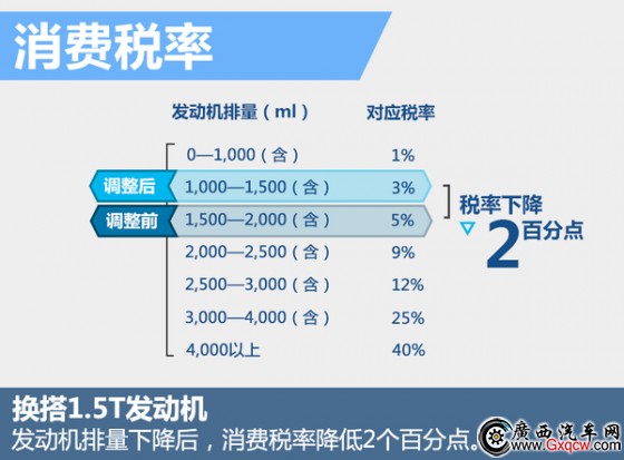 換搭小排量發(fā)動(dòng)機(jī)的GA6消費(fèi)稅會(huì)有所降低。在車價(jià)當(dāng)中稅率部分包括了25%的消費(fèi)稅、17%的增值稅。其中增值稅相對(duì)固定,因此消費(fèi)稅在車輛價(jià)值中的影響因素更為重要!跋M(fèi)稅”由生產(chǎn)企業(yè)向稅務(wù)機(jī)關(guān)繳納,但最終會(huì)體現(xiàn)在車價(jià)當(dāng)中。新款GA6搭載1.5T發(fā)動(dòng)機(jī)對(duì)應(yīng)稅率為3%,相比1.6T發(fā)動(dòng)機(jī)下調(diào)了2個(gè)百分點(diǎn)。以目前1.6T手動(dòng)舒適型11.68萬元的售價(jià)為例,消費(fèi)稅率下降2個(gè)百分點(diǎn)后,新車售價(jià)將降低2,336元。(網(wǎng)通社 2016年3月21日 北京報(bào)道)
