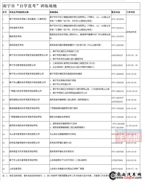 答:目前,南寧市指定駕駛證“自學(xué)直考”科目二訓(xùn)練場地有18個,其中有14個是駕培機(jī)構(gòu)的場地。學(xué)員前往訓(xùn)練場前,請先打電話跟這些場地負(fù)責(zé)人咨詢;此外,進(jìn)入場地學(xué)習(xí)費用,需要自學(xué)人員與場地方自行協(xié)商。據(jù)了解,自己帶車帶隨車指導(dǎo)人員的,南寧訓(xùn)練場地一般收費是30元-50元/小時。