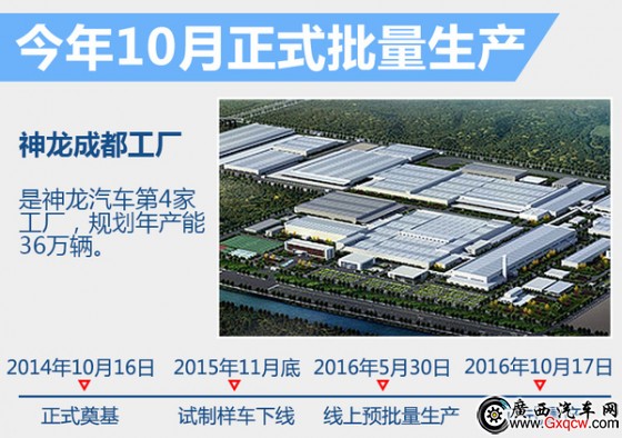 在2014年10月16日,總投資額達(dá)123億元的成都項(xiàng)目正式奠基,成為神龍汽車(chē)在國(guó)內(nèi)的第四座生產(chǎn)基地。時(shí)隔一年,首臺(tái)試制樣車(chē)(東風(fēng)標(biāo)致全新SUV)于2015年11月正式下線。進(jìn)入“十三五”開(kāi)局之年,神龍第四工廠將正式投入運(yùn)營(yíng),神龍汽車(chē)有限公司成都工廠黨委籌備組負(fù)責(zé)人吳政透露:“今年5月30日,成都工廠將進(jìn)行線上預(yù)批量生產(chǎn),10月17日將正式投產(chǎn)!钡浇衲昴甑,神龍第四工廠預(yù)計(jì)將生產(chǎn)出1萬(wàn)輛新車(chē)。