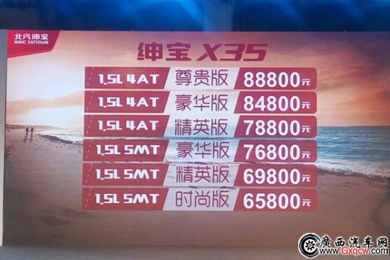 5月20日,北汽紳寶X35正式宣布上市,新車(chē)定位為小型SUV,搭載1.5L自吸發(fā)動(dòng)機(jī)共推出6款車(chē)型,并有4AT自動(dòng)擋可選。紳寶X35售價(jià)區(qū)間為6.58-8.88萬(wàn)元,具體售價(jià)信息參看下表: