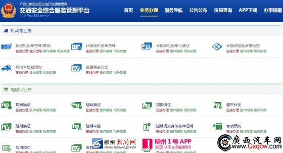 據(jù)了解,目前柳州交警支隊在該平臺上已經(jīng)實現(xiàn)機動車變更聯(lián)系方式、駕駛證遺失損毀補換證、駕駛證延期換證、駕駛證變更聯(lián)系方式、駕駛證延期審驗、駕駛證延期提交身體條件證明、駕駛證期滿換證、預(yù)約駕駛?cè)丝颇靠荚、機動車安全技術(shù)檢驗預(yù)約、臨時號牌核發(fā)10項業(yè)務(wù)網(wǎng)上辦理。