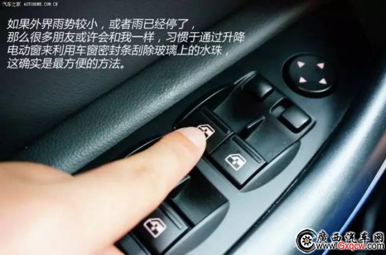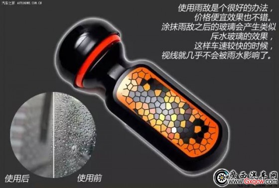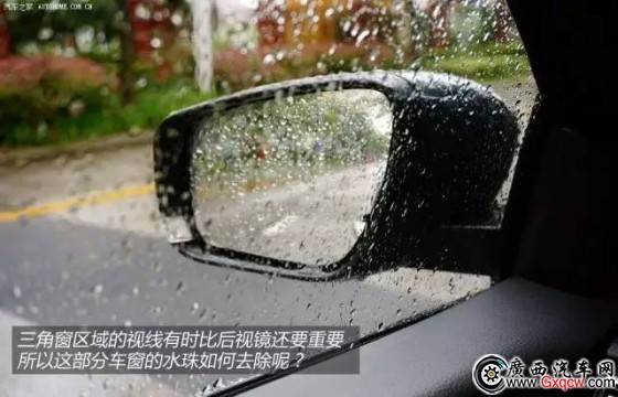 將原本用來(lái)涂抹在擋風(fēng)玻璃上的雨敵(又叫“撥雨劑”)用在三角窗上,使小三角窗的部位形成類似斥水玻璃的效果,雨水落在這個(gè)區(qū)域的時(shí)候就會(huì)凝聚成水珠滑落, 若是車速提升之后,雨滴更是會(huì)加速的向后滑落,三角窗區(qū)域的視線幾乎不會(huì)被大雨所影響。這樣處理之后,只要您不經(jīng)常洗車,效果保持1-2個(gè)月還是沒有問題 的。