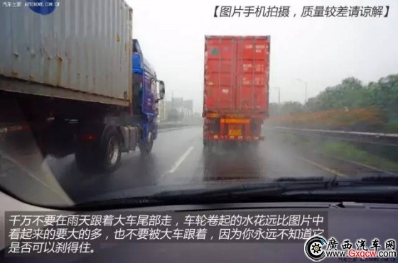 在雨勢(shì)較大的時(shí)候,大車的車輪甩起的水霧往往要比小車的大的多,若是緊跟著大車行駛,視線會(huì)受到嚴(yán)重的影響,身處車內(nèi)幾乎很難看清眼前的路況,即便雨刮器開 得很大,也僅僅是緩解一下而已,很容易發(fā)生追尾的危險(xiǎn)。要知道,任何一臺(tái)家用轎車,追尾這樣一個(gè)大車都不會(huì)有什么好結(jié)果的。