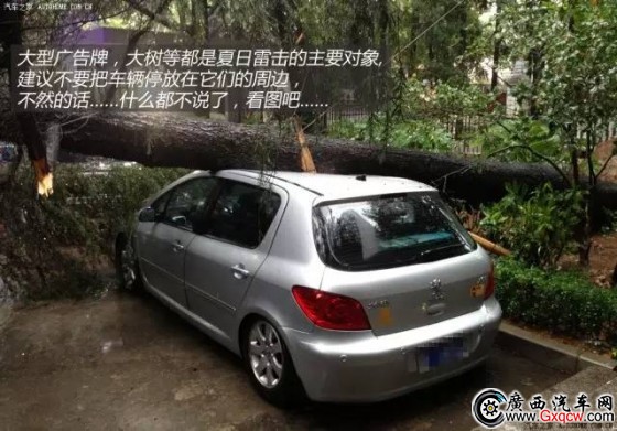 大型廣告牌、大樹和電線桿是夏日雷擊的主要對(duì)象,如果把車停在他們的旁邊,那么很有可能回來(lái)時(shí)你的愛車就會(huì)和圖片上的一樣了……在條件允許的情況下,雨天還是建議大家盡量把車?吭谡(guī)的大型停車場(chǎng)里。