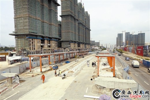 7月11日上午,在南寧市長堽路第十七中學(xué)門前,一臺挖掘機在南寧市快速公交系統(tǒng)(簡稱BRT,是一種介于快速軌道交通與常規(guī)公交之間的新型公共客運系統(tǒng))試點工程圍擋內(nèi)開始施工。當日,長堽路、民主路、人民東路及朝陽路段的10對站點同時開始進行綠化遷移、圍擋施工。這標志著BRT項目全線16對站點中的15對站點進入全面施工階段,另外的一對站點火車站站點計劃8月開工,預(yù)計今年年底完工并投入試運營