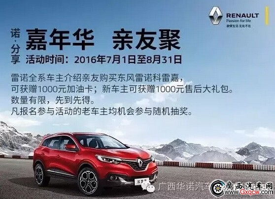 (廣西汽車網(wǎng) 訊)編輯從華諾官微了解到,即日起到8月31日,雷諾全系車主成功推薦親友到廣西華諾雷諾專營店購買東風(fēng)雷諾科雷嘉,可獲贈(zèng)價(jià)值1000元的加油卡,新車主可獲贈(zèng)價(jià)值1000元的售后大禮包。數(shù)量有限,先到先得。