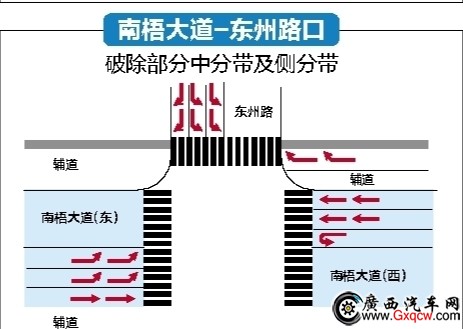 南梧大道東進(jìn)口段破除中分帶,增設(shè)2條左轉(zhuǎn)車道;破除部分側(cè)分帶,增設(shè)非機(jī)動車左轉(zhuǎn)車道;西進(jìn)口破除部分中分帶,增設(shè)掉頭車道;破除側(cè)分帶,增設(shè)機(jī)動車右轉(zhuǎn)車道。東州路南進(jìn)口段也將破除部分中分帶,增設(shè)1條左轉(zhuǎn)機(jī)動車道。