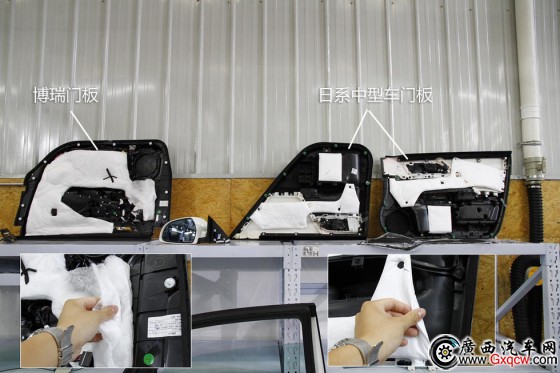 最左邊的是博瑞的內襯板,其余的是某日系中型車的,可以看到博瑞內部的隔音棉覆蓋面積更大,而且厚度不錯,不過邊緣的規(guī)整度不如日系合資車。