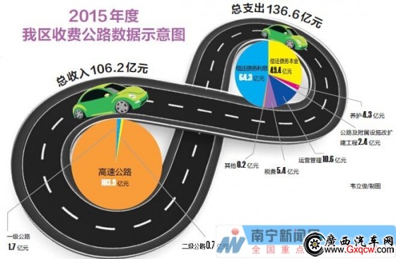 我區(qū)有多少公路收費(fèi)?一年能收多少錢?這些錢都花在哪了?日前,自治區(qū)交通運(yùn)輸廳公布了《2015年廣西收費(fèi)公路統(tǒng)計(jì)公報(bào)》,公報(bào)顯示,截至2015年年底,全區(qū)公路通車總里程達(dá)11.8萬公里,其中收費(fèi)公路里程為4968.3公里。廣西收費(fèi)公路通行費(fèi)收入為106.2億元,支出總額為136.6億元,通行費(fèi)收支缺口30.4億元,收支缺口進(jìn)一步擴(kuò)大。