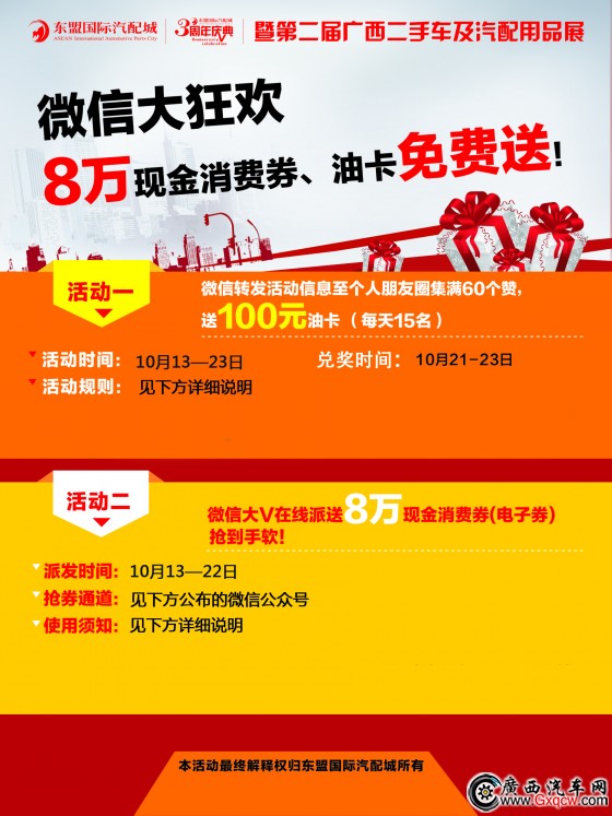 同時(shí),關(guān)注并轉(zhuǎn)發(fā)東盟國(guó)際汽配城新車(chē)贈(zèng)油卡活動(dòng)至朋友圈,集滿(mǎn)60個(gè)贊,即可獲贈(zèng)100元油卡。