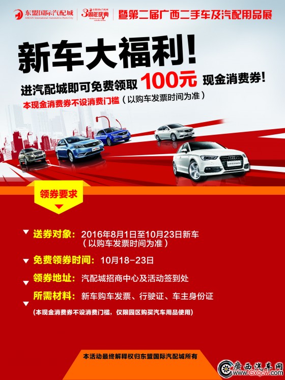 2016年8月1日-10月23日購(gòu)車(chē)新車(chē)主,10月18-23日期間,憑購(gòu)車(chē)發(fā)票、行駛證、身份證等有效證件在園區(qū)招商中心可免費(fèi)領(lǐng)取100元現(xiàn)金消費(fèi)券1張。