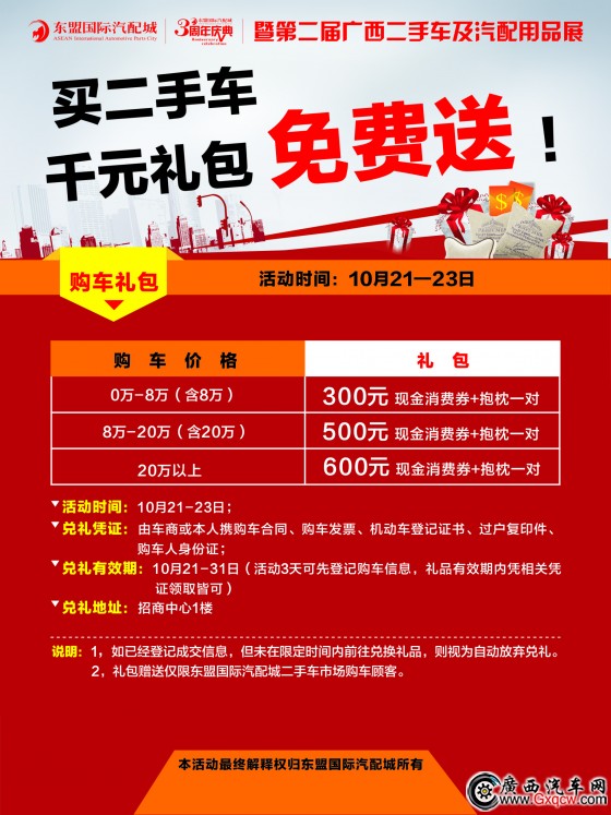 現(xiàn)場(chǎng)購(gòu)買(mǎi)二手車(chē)或汽配用品消費(fèi)滿(mǎn)100元客戶(hù),可憑購(gòu)車(chē)合同、購(gòu)物發(fā)票至東盟國(guó)際汽配城招商中心免費(fèi)參加抽紅包活動(dòng),100-2000元紅包及精美禮品等你拿,100%中獎(jiǎng)。