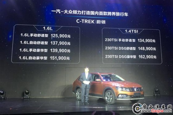 2016年11月3日,一汽-大眾基于PQ34平臺的首款跨界休旅車C-TREK蔚領(lǐng)在麗江雪山下正式上市,新車共推出搭載1.6L和1.4TSI發(fā)動機(jī)的7款車型,售價12.59-16.29萬元。蔚領(lǐng)的車型名稱與大眾進(jìn)口旅行車蔚攬組成家族化命名方式,作為一汽-大眾推出的首款A(yù)級跨界旅行車,蔚領(lǐng)擁有著大空間、多功能和良好的通過性的優(yōu)點,可以滿足親朋好友一起長途旅行的需求。