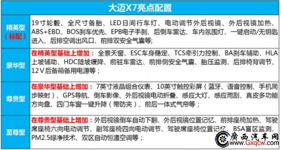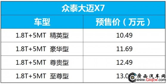 1月9日,大邁X7發(fā)布了其預售價,新車將首先推出1.8T+5MT動力組合的4款車型,預售價區(qū)間為10.49—13.09萬元。據(jù)悉,目前大邁X7實車已到店并接受預定。