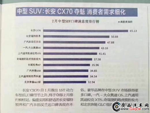 上市至今,長(zhǎng)安CX70已獲得了超過12萬的用戶。銷量是一方面,更重要的是,長(zhǎng)安CX70產(chǎn)品口碑同樣處于行業(yè)領(lǐng)先地位,據(jù)中國(guó)汽車報(bào)2月的統(tǒng)計(jì)數(shù)據(jù),長(zhǎng)安CX70在中型SUV口碑滿意度排名第一,遠(yuǎn)超同級(jí)車型。