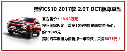 更叫人驚喜的是,獵豹汽車此次為了回報(bào)廣大消費(fèi)者,繼續(xù)放出大招:原本不享受國(guó)家購(gòu)置稅優(yōu)惠的獵豹CS10 2.0T車型同樣享受5%購(gòu)置稅的巨大優(yōu)惠!