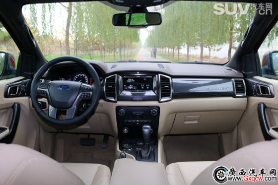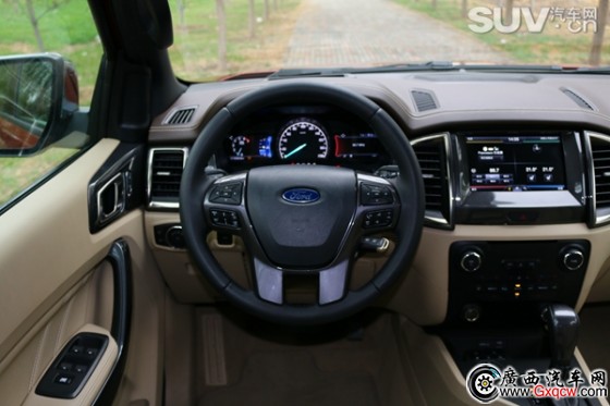 內(nèi)飾方面,撼路者同樣有著明顯地福特風格,上深下淺的配色顯得比較溫馨,中控臺采用皮質包裹,中控臺功能豐富,儀表臺科技感十足,配置豐富,硬漢也有細膩的地方。此外,中控臺由上至下分別為顯示屏、多媒體以及空調系統(tǒng),簡潔明朗,上手沒什么難度,忙操作也沒有什么問題。
