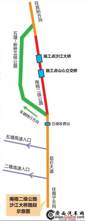 今年3月21日,因國道322線南寧市興寧區(qū)七塘路段K768+190沙江大橋和K769+631山心立交橋橋梁需要維修,七塘路段(K767+500~K771+400)實行封閉施工,施工期間禁止一切車輛通行。如果從南寧開車去賓陽,就要從七塘路口繞行三級公路028縣道,行駛約10公里后到九塘路口,再駛回南梧二級公路。另外,也有部分司機選擇從古辣高速入口繞行。