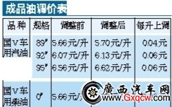 這次成品油價(jià)格調(diào)整后,廣西國V標(biāo)準(zhǔn)89號汽油調(diào)整到5.70元/升,92號汽油調(diào)整到6.13元/升,95號汽油調(diào)整到6.62元/升,國V標(biāo)準(zhǔn)0號車用柴油調(diào)整到5.72元/升。
