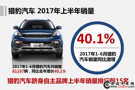 據(jù)最新銷量數(shù)據(jù)顯示,2017年上半年,獵豹汽車在SUV和皮卡市場火力全開,整體銷量達到61197輛,同比去年增長40.1%。憑借著這股強勁的上升勢頭,獵豹汽車在上半年銷量排行中成功躋身自主品牌行列的前15名,展現(xiàn)出向上突破的強大實力。在SUV市場,主力車型獵豹CS10表現(xiàn)尤為突出,同時隨著獵豹CS9加速走向市場,獵豹汽車的市場潛力將有望得到進一步釋放。