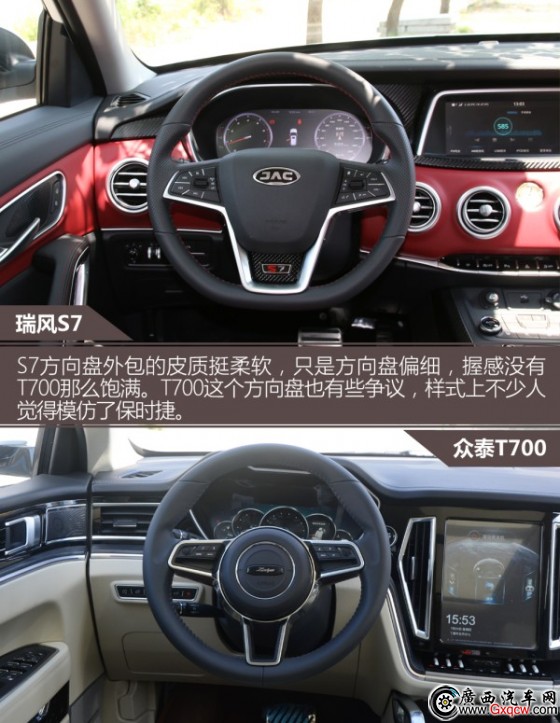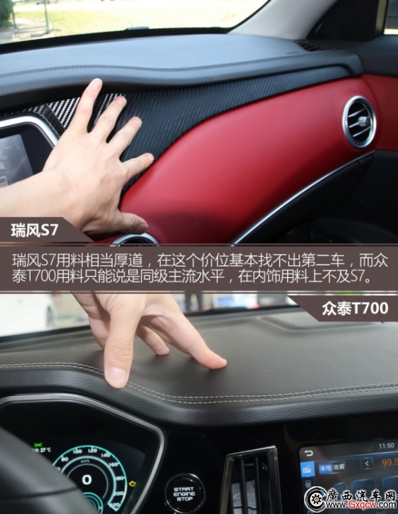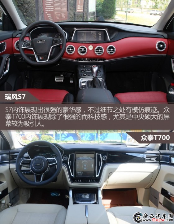 瑞風(fēng)S7內(nèi)飾展現(xiàn)出很強的豪華感,除了設(shè)計上的因素以外,用料也是其亮點。中控除了搪塑材質(zhì)以外,紅色部分都是皮質(zhì)包裹,手感相當(dāng)棒。只是遺憾的是像空調(diào)出風(fēng)口這些細(xì)節(jié)還有些模仿的痕跡。眾泰T700內(nèi)飾展現(xiàn)出了很強的而科技感,尤其是中央碩大的屏幕較為吸引人,中控以直線條為主,用料多以搪塑為主,因而材質(zhì)來說沒有對手那么有誠意。