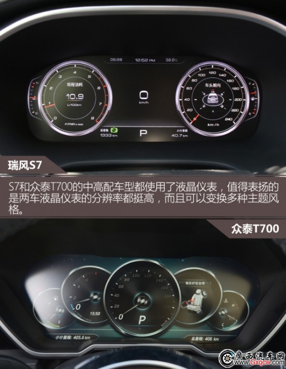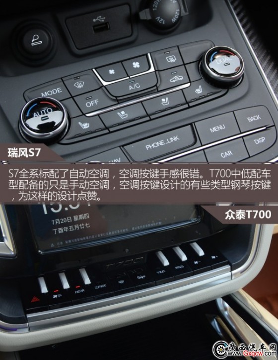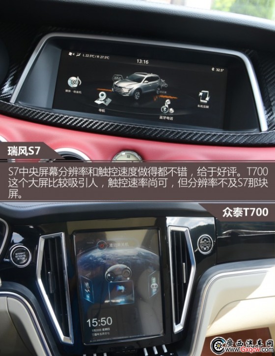 S7中央屏幕分辨率和觸控速度做得都不錯,給于好評。T700這個大屏比較吸引人,觸控速率尚可,但分辨率不及S7那塊屏。兩車多媒體配置都很齊全,影音播放、藍牙電話、導(dǎo)航、全景影像(高配)等都有配備,此外還都帶有手機互聯(lián)功能。