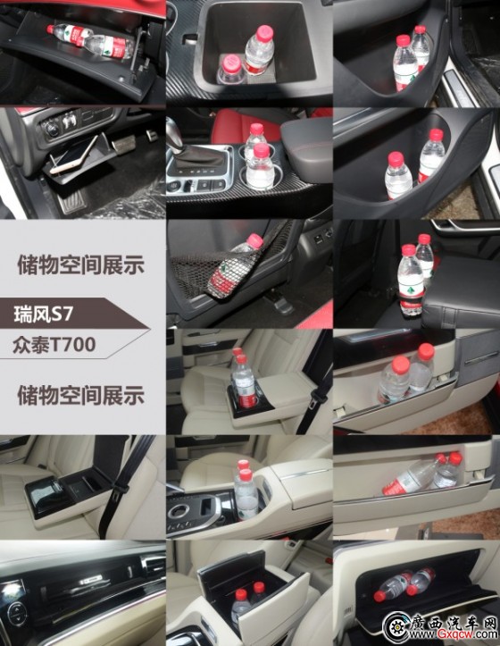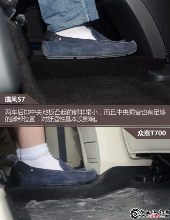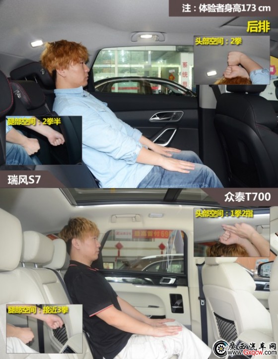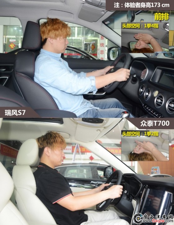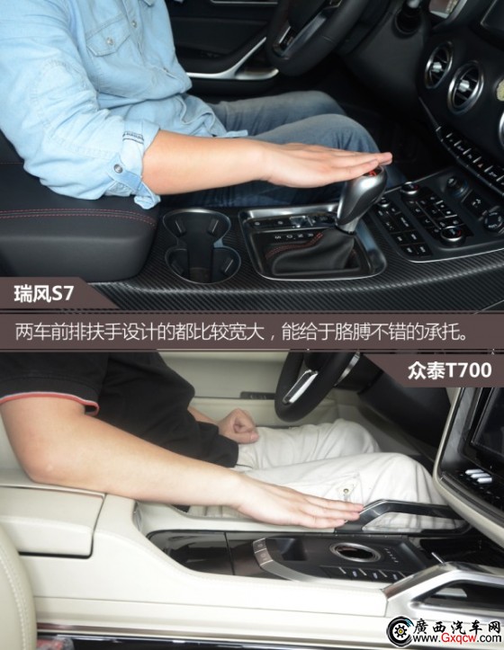 身高173cm體驗者在瑞風S7前排得到1拳4指的成績,T700前排頭部空間為1拳1指,表現(xiàn)遜于S7。兩車前排扶手設計的都比較寬大,可以給于胳膊不錯的承托。