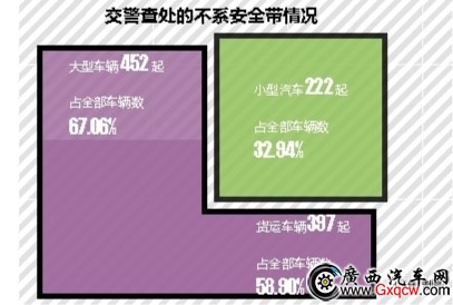 南寧新聞網-南寧晚報訊(記者 周志英 實習生 劉鳳平 通訊員 玉麗平)昨日,記者從南寧市公安局交警支隊一大隊了解到,該大隊自7月25日起,在轄區(qū)啟動“不系安全帶”專項整治行動,重點針對轄區(qū)機動車駕駛員及乘客不系安全帶開展整治查處。截至8月3日,在轄區(qū)共查處機動車駕駛員、乘客不系安全帶違法行為共674起。據(jù)統(tǒng)計,在查獲的不系安全帶的車輛中,面包車、小轎車等小型汽車為222起,占全部車輛數(shù)的32.94%;貨車、牽引車、掛車、半掛車等大型車輛為452起,占全部車輛數(shù)的67.06%。而作為整治行動重點嚴查的五類車中,貨運車輛占比最高,有397起,占全部車輛數(shù)的58.90%。