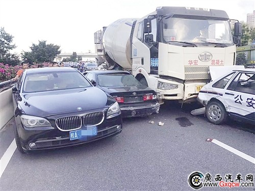 稍晚時(shí)分,南寧交警部門通報(bào)事故情況。據(jù)通報(bào)內(nèi)容,當(dāng)晚6時(shí)10分,青竹立交往雙擁崗方向下橋處因?yàn)?輛水泥罐車剎車失靈,撞上1輛警車后又連續(xù)撞上9輛私家車,事故造成私家車、警車不同程度受損,1輛私家車上的一名孕婦受驚被送往醫(yī)院檢查。交警啟動(dòng)應(yīng)急處置,7時(shí)左右交通恢復(fù)暢通。