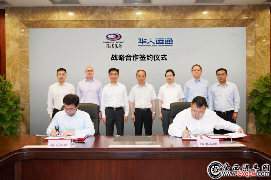 (圖片說明:華人運通董事長丁磊(左一)、臨港集團總裁袁國華(右一)代表雙方簽約)