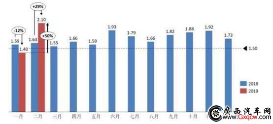 3月10日,中國汽車流通協(xié)會對外公布,2019年2月經(jīng)銷商綜合庫存系數(shù)為2.1,同比上升29%,環(huán)比上升50%;庫存預警指數(shù)為63.6%,環(huán)比上升4.7%,庫存預警指數(shù)位于警絨線以上。這意味著,繼1月庫存增加之后,汽車廠家仍舊在2月這個春節(jié)所在的淡季月份,持續(xù)向經(jīng)銷商“庫存”。