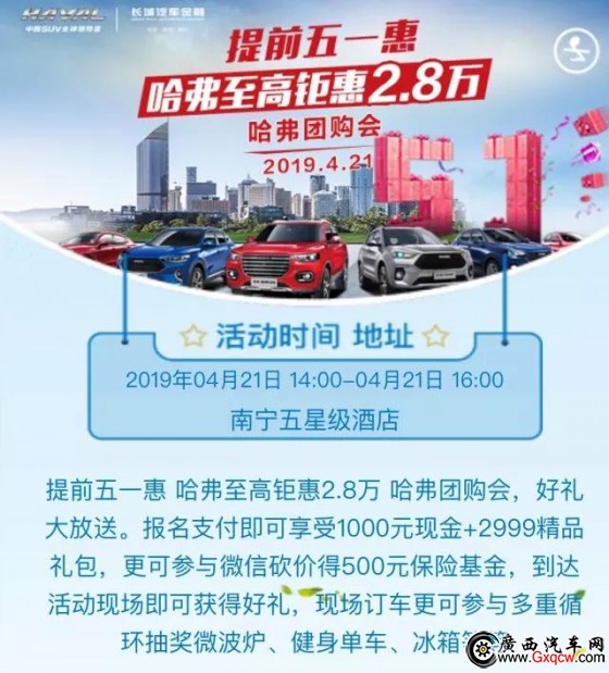 2019年4月21日(周日)“#提前五一惠# 哈弗至高綜合優(yōu)惠2.8萬南寧站-哈弗團購會火熱報名中。!